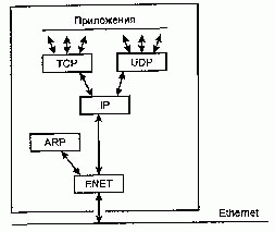 Модули TCP, UDP и драйвер Ethernet являются мультиплексорами типа n x 1. Действуя как мультиплексоры, они переключают несколько входов на один выход. Они также являются демультиплексорами типа 1 х n. Как демультиплексоры, они переключают один вход на один из многих выходов в соответствии с полем типа в заголовке протокольного блока данных. Когда Ethernet-кадр попадает в драйвер сетевого интерфейса Ethernet, он может быть направлен либо в модуль ARP, либо в модуль IP. (Значение поля типа в заголовке кадра указывает, куда должен быть направлен Ethernet-кадр).