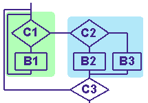 Как вам этот вариант? Мне кажется он тоже имеет право на жизнь, хотя лично мне вариант с четырьмя состояниями нравится больше. Как-то он нагляднее показывает что куда переходит и при каких условиях. А вам? Предвижу возражения такого толка, что при подобном подходе программы будут иметь повышенную склонность к зацикливанию. И да и нет. Циклы вообще склонны к зацикливанию :-) особенно если написать что-нибудь вроде repeat until false;. Так на то и голова дана, чтобы карась не дремал! А если серьезно, то устойчивость работы преобразованных таким образом программ прямо и недвусмысленно показывает, насколько удачно вы проработали исходную блок-схему и насколько аккуратно ее преобразовали. Поскольку на то оно и инвариантное преобразование, чтобы ничего не менять в смысле и логике программы, а затрагивать лишь ее внешнее представление.