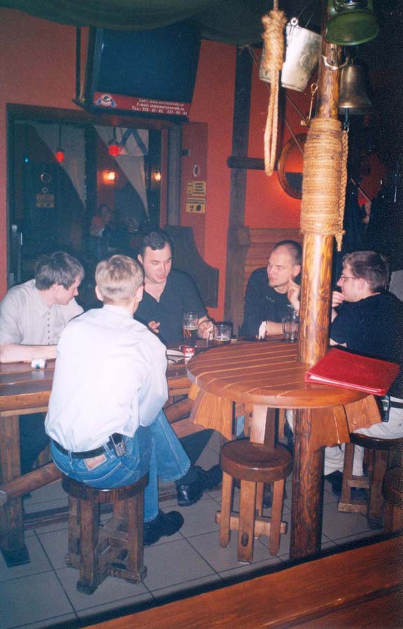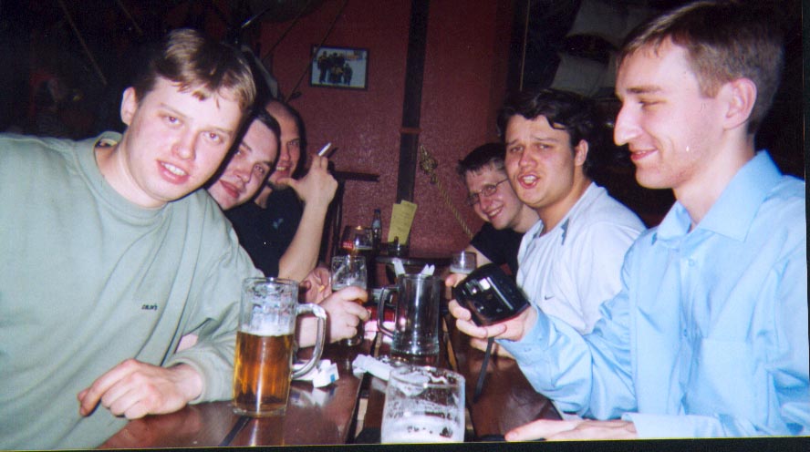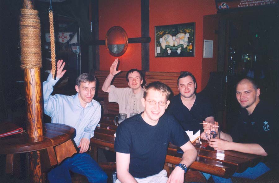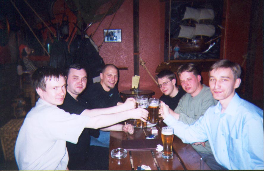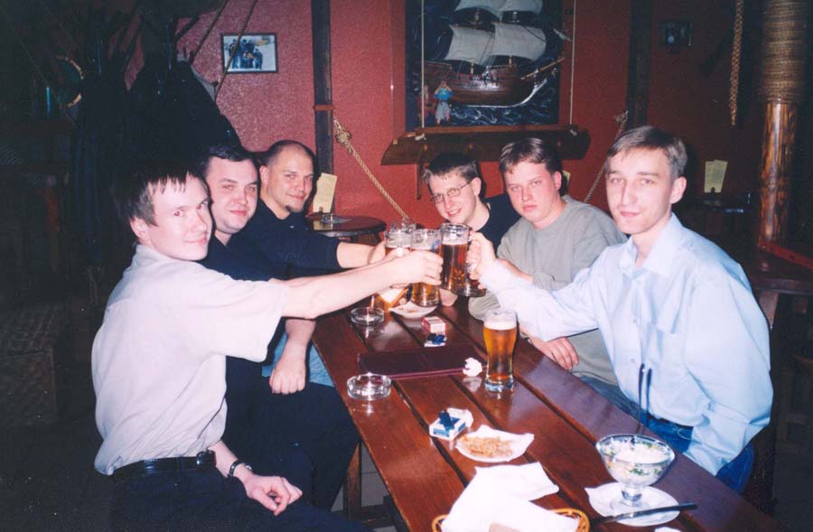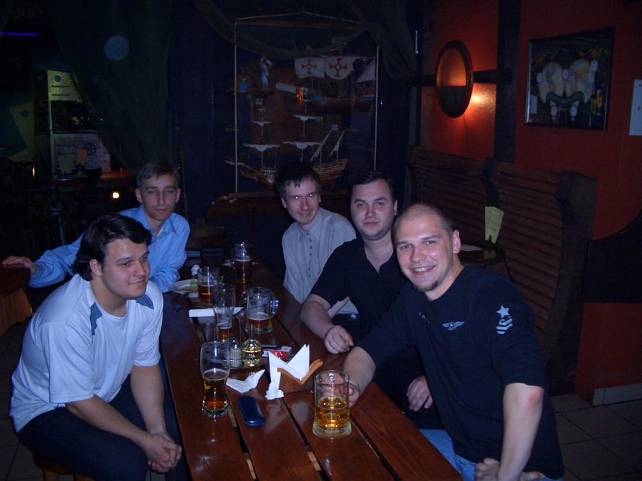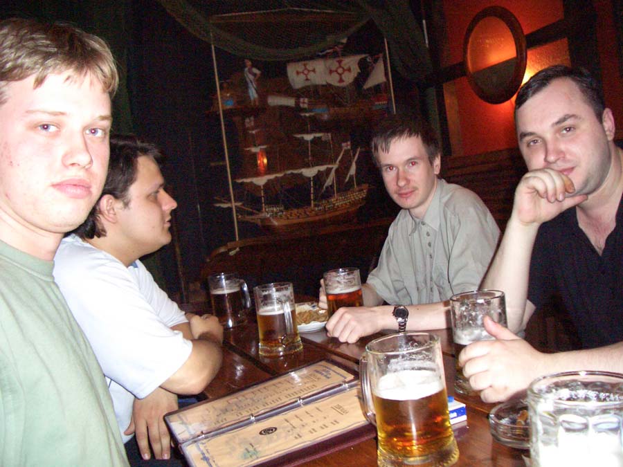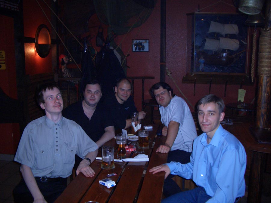 Решил я этой весной или летом непременно съездить в Питер. Со мной почти собрался было поехать AQL, но к сожалению не смог. В итоге поехали в Питер мы вдвоем с моим братом. Самое примечательное, что как раз к нашему приезду, наши питерские коллеги и участники форума на Исходниках.РУ решили провести встречу у себя в Питере. В северной столице приютил и встретил нас с поезда reporter, за что ему отдельная благодарность. Первый день в Питере прошел на ура, погода была просто отличная. К сожалению во второй день она нас подвела, а ведь это как раз и был день сейшена. Хотя это нам все равно не помешало днем погулять по питерским улицам. День прошел очень быстро, нам пришлось почти бегом осматривать все достопримечательности чтобы успеть на встречу. Но в конце концов мы все таки встретились и Uncle_Bob повел нас в бар "Морской Волк". Кабачок оказался очень красивым местом, мы даже через чур много фоток потратили на его интерьеры, а не на нас самих. Чего только мы не делали на этом сейшене и на руках мерялись, кто кого завалит и даже через забор прыгали. Каюсь это была моя идея, зато сумел заставить reporter'a поверить в свои силы, забор то был высокий :) После него и Uncle_Bob заразился тягой к спорту, а потом уже все участники высыпали на улицу, вот смеха то было. Жаль фоток с прыжками никто не сделал. Конечно, кроме этого, мы и пивка попили и пообщались неплохо. Засиделись почти до закрытия метро. Все были очень довольны, что мы собрались. Вобщем встреча была отличная и мы все ждем, когда питерцы нанесут нам в Москву ответный визит. Участвовали в этой встрече семь человек: 1. Leprecon 2. Белый - брат Leprecon'a 3. Uncle_Bob 4. Vad_dimm 5. Muran 6. Math 7. reporter А вот, собственно, представляем вашему вниманию фотки с нашей встречи. | |