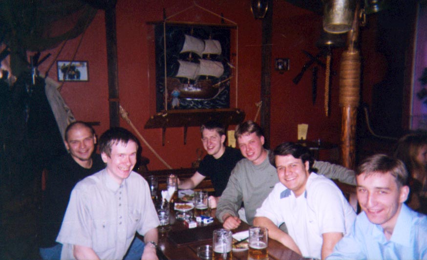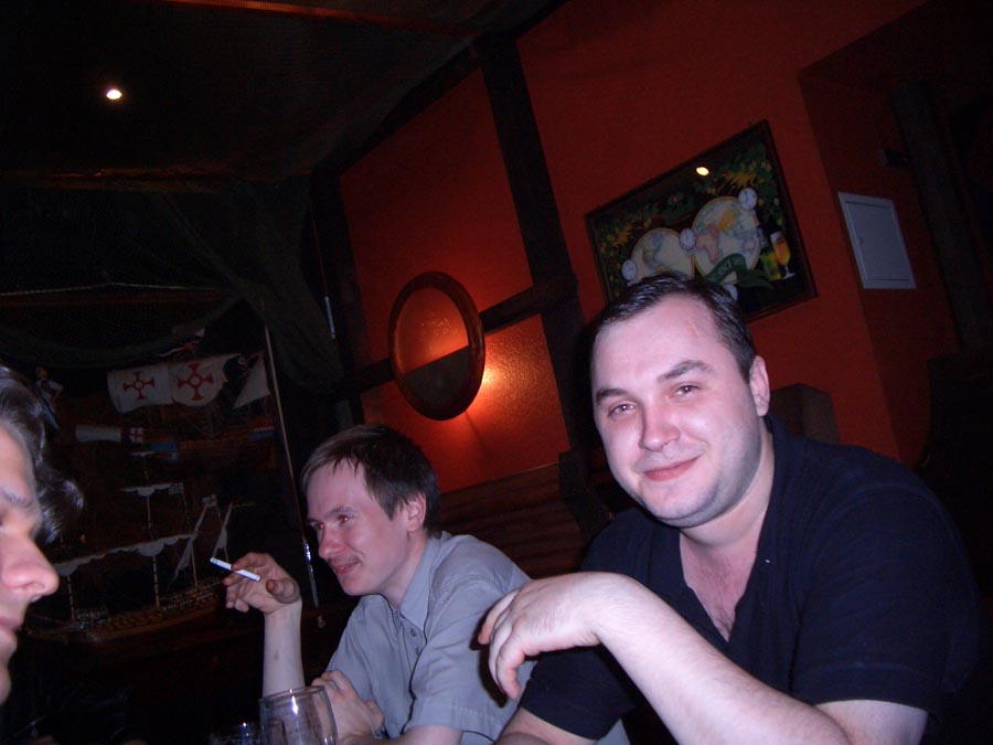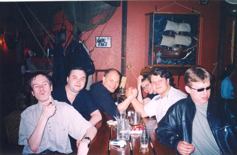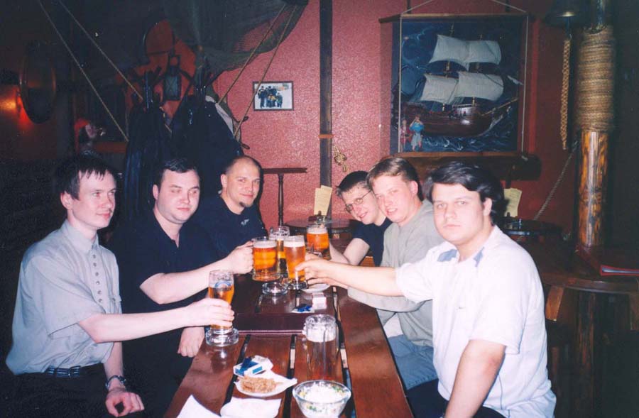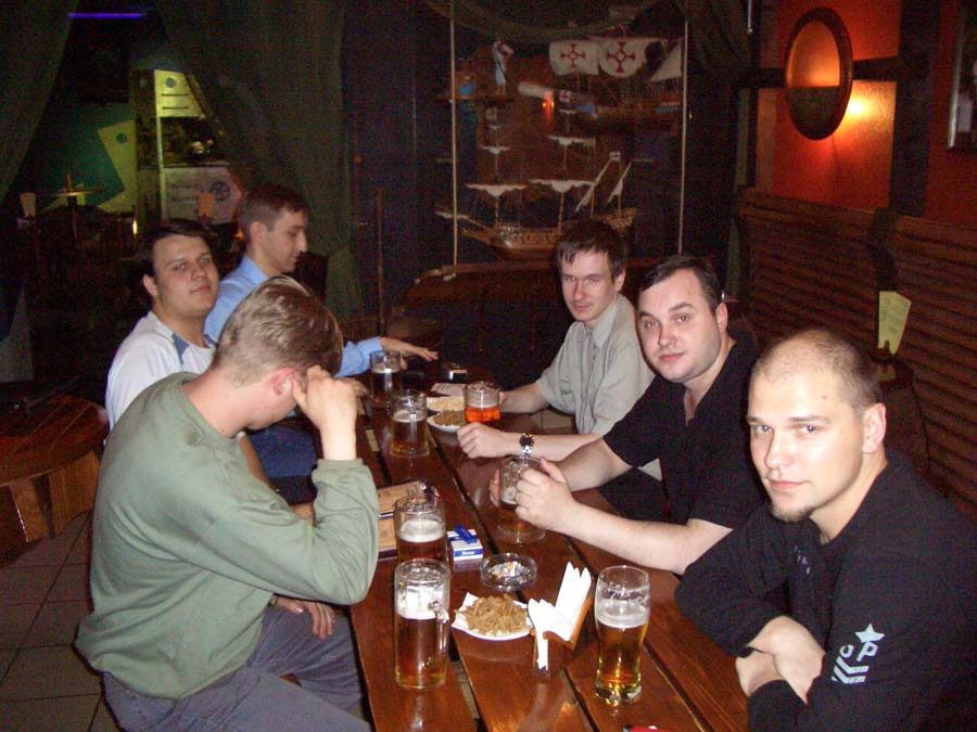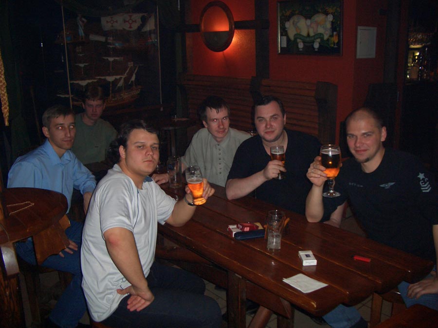 Решил я этой весной или летом непременно съездить в Питер. Со мной почти собрался было поехать AQL, но к сожалению не смог. В итоге поехали в Питер мы вдвоем с моим братом. Самое примечательное, что как раз к нашему приезду, наши питерские коллеги и участники форума на Исходниках.РУ решили провести встречу у себя в Питере. В северной столице приютил и встретил нас с поезда reporter, за что ему отдельная благодарность. Первый день в Питере прошел на ура, погода была просто отличная. К сожалению во второй день она нас подвела, а ведь это как раз и был день сейшена. Хотя это нам все равно не помешало днем погулять по питерским улицам. День прошел очень быстро, нам пришлось почти бегом осматривать все достопримечательности чтобы успеть на встречу. Но в конце концов мы все таки встретились и Uncle_Bob повел нас в бар "Морской Волк". Кабачок оказался очень красивым местом, мы даже через чур много фоток потратили на его интерьеры, а не на нас самих. Чего только мы не делали на этом сейшене и на руках мерялись, кто кого завалит и даже через забор прыгали. Каюсь это была моя идея, зато сумел заставить reporter'a поверить в свои силы, забор то был высокий :) После него и Uncle_Bob заразился тягой к спорту, а потом уже все участники высыпали на улицу, вот смеха то было. Жаль фоток с прыжками никто не сделал. Конечно, кроме этого, мы и пивка попили и пообщались неплохо. Засиделись почти до закрытия метро. Все были очень довольны, что мы собрались. Вобщем встреча была отличная и мы все ждем, когда питерцы нанесут нам в Москву ответный визит. Участвовали в этой встрече семь человек: 1. Leprecon 2. Белый - брат Leprecon'a 3. Uncle_Bob 4. Vad_dimm 5. Muran 6. Math 7. reporter А вот, собственно, представляем вашему вниманию фотки с нашей встречи. | |