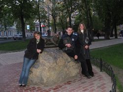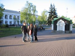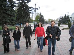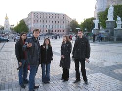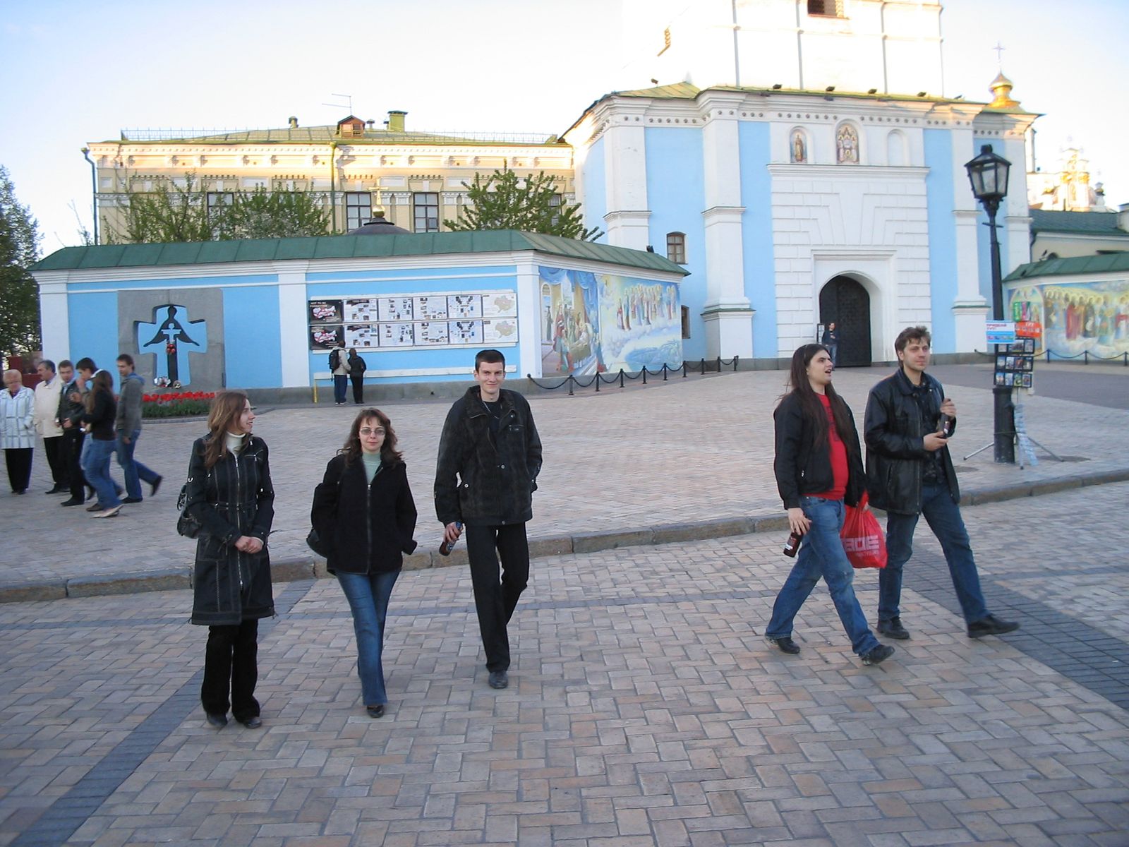 Мы опять вернулись на Михайловскую площадь. Позади Kas@tk-и, SeaGirl, orb-а, LuckLess-а и Shaman-а - стена Михайловского собора и Памятнике жертвам голодомора.