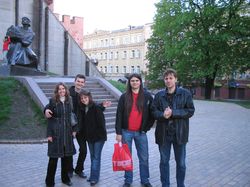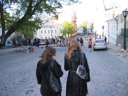А это мы уже дошли до Андреевского Спуска: SeaGirl, Kas@tka, LuckLess слушают рассказ Shaman-а, а orb вроде как собирался ещё и сфотографировать, но, похоже, передумал. А C06akaDuka только-только слинял по делам в неизвестном направлении, но с обещанием ещё вернуться.