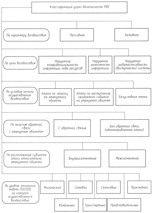 Итак, перейдем к классификации угроз из выделенного множества В1. Основная цель любой классификации состоит в том, чтобы предложить такие отличительные признаки, используя которые, можно наиболее точно описать характеризуемые явления или объекты. Поскольку ни в одном из известных авторам научных исследований не проводилось различия между локальными и удаленными информационными воздействиями на ВС, применение уже известных обобщенных классификаций для описания удаленных воздействий не позволяет более или менее точно раскрыть их сущность и описать механизмы и условия их осуществления. Для более точного описания угроз безопасности РВС (из множества В1) предлагается следующая классификация (см. рис. 3.1).