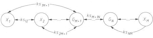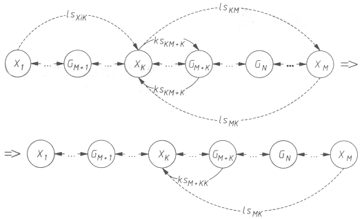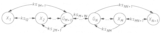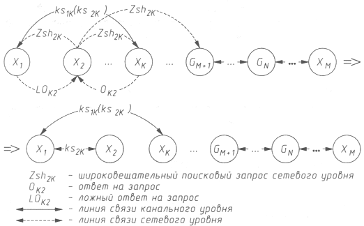 Тогда далее граф взаимодействия объектов РВС изменяется следующим образом: исчезает линия связи канального уровня ks2M+1, соединяющая объекты Х2 и GM+1 и появляется линия связи ks2M+1, которая теперь соединяет объекты X2 и Х1 (объект X1 воспринимается объектом X2 как роутер GM+1). Соответственно на канальном уровне путь между Х2 и XM проходит теперь через вершины X1, GM+1 ... GN.