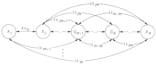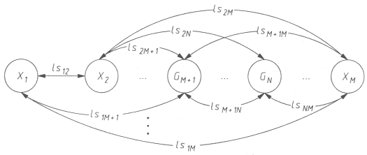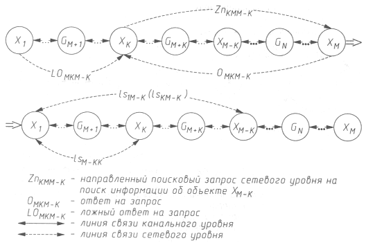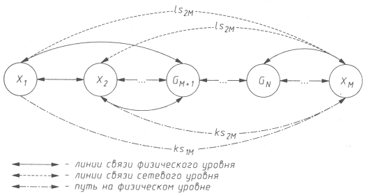 Пусть объект Х2 взаимодействует с объектом ХM. На графе это взаимодействие на сетевом уровне показано двунаправленным ребром ls2M, которое располагается между вершинами Х2 и XM. Соответственно на канальном уровне путь между объектами Х2 и ХM проходит через вершины GM+1...GN.