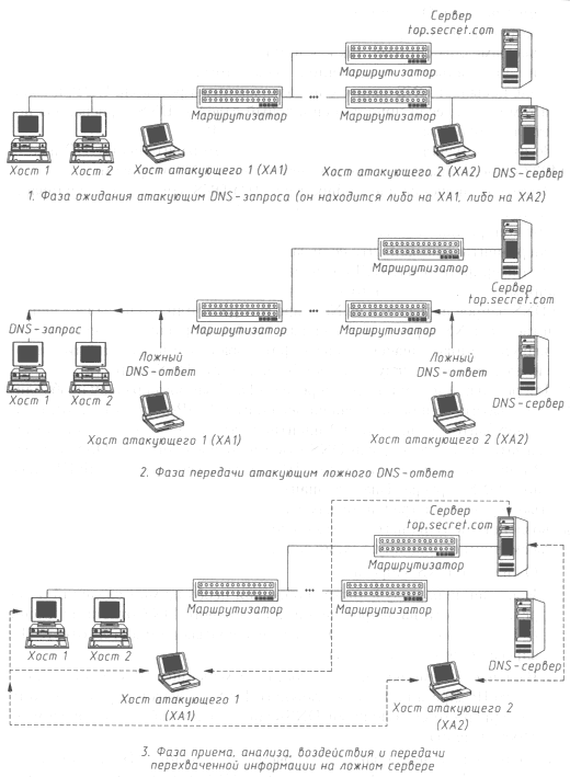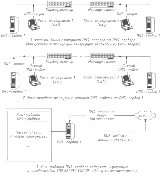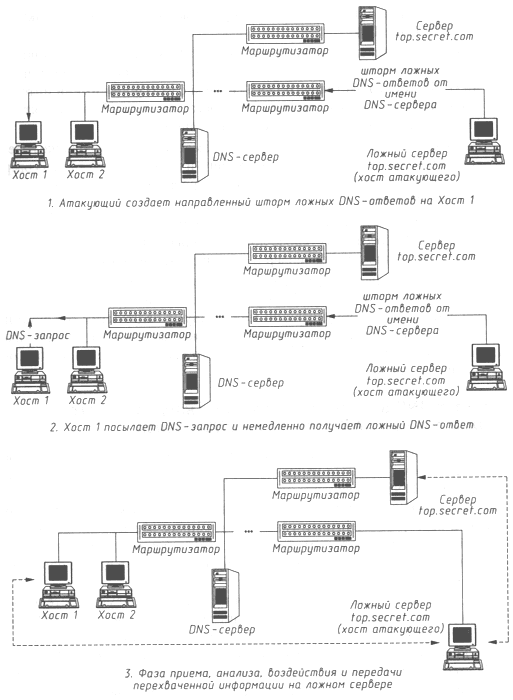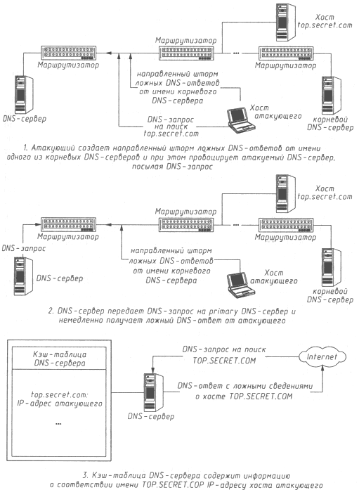 Анализ подробно описанной здесь схемы удаленного DNS-поиска показывает, что если на запрос от DNS-сервера атакующий направит ложный DNS-ответ или (в случае шторма ложных ответов) будет вести их постоянную передачу, то в кэш-таблице сервера появится соответствующая запись с ложными сведениями, и в дальнейшем все хосты, обратившиеся к данному DNS-серверу, будут дезинформированы, а при адресации к хосту, маршрут к которому кракер решил изменить, связь с ним будет осуществляться через хост атакующего по схеме "ложный объект РВС". И, что хуже всего, с течением времени эта ложная информация, попавшая в кэш DNS-сервера, начнет распространяться на соседние DNS-серверы высших уровней, а следовательно, все больше хостов в Internet будут дезинформи-рованы и атакованы.
