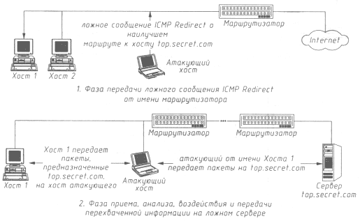 В первом случае кракер находится в том же сегменте сети, что и объект атаки. Тогда, послав ложное ICMP-сообщение, он в качестве IP-адреса нового маршрутизатора может указать свой IP-адрес или любой из адресов данной подсети. Это даст атакующему возможность перемаршрутизировать сообщения, направляемые атакованным хостом на определенный IP-адрес, и получить контроль над трафиком между этим хостом и интересующим взломщика сервером. Далее атака перейдет во вторую стадию, связанную с приемом, анализом и передачей пакетов, получаемых от "обманутого" хоста. Рассмотрим функциональную схему осуществления этой атаки (рис. 4.11):