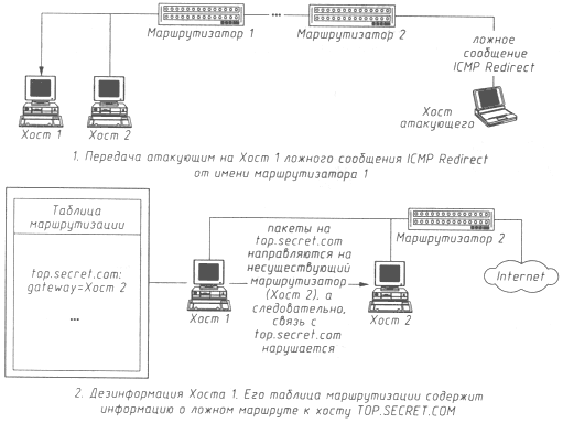 Рис. 4.12. Межсегментное навязывание хосту ложного маршрута при использовании протокола ICMP, приводящее к отказу в обслуживании