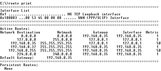 Общеизвестно, что маршрутизация в Сети играет важнейшую роль для обеспечения ее нормального функционирования. Маршрутизация в Internet осуществляется на сетевом уровне (IP-уровень). На программном уровне для ее обеспечения в памяти сетевой операционной системыкаждого хоста существуют специальные таблицы, содержащие данные о возможных маршрутах. На аппаратном уровне каждый сегмент Сети подключен к глобальной сети как минимум через один маршрутизатор, а следовательно, все хосты и маршрутизатор должны физически располагаться в одном сегменте. Поэтому все сообщения, адресованные в другие сегменты Сети, направляются на маршрутизатор, который, в свою очередь, перенаправляет их далее по указанному в пакете IP-адресу, выбирая при этом оптимальный маршрут. Рассмотрим, что представляет собой таблица маршрутизации хоста. Она состоит из пяти колонок: сетевой адрес, сетевая маска, адрес маршрутизатора, интерфейс и метрика (см. рис. 4.9)