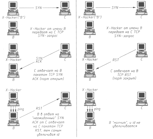 X-Hacker посылает TCP SYN-запрос на порт Х хоста С от имени В (автор метода предлагает для этого использовать утилиту hping с его сайта http://www.kyuzz.org/antirez, но можно применять и любые другие программные средства). Если порт Х хоста С открыт, то хост С пошлет на хост В ответ TCP SYN АСК (хост С не может знать, что этот пакет на самом деле пришел от X-Hacker). В этом случае объект В в ответ на TCP SYN АСК ответит на С пакетом TCP RST. Если атакующий пошлет на С определенное количество TCP SYN от имени хоста В, то В, получив несколько TCP SYN АСК, ответит столькими же TCP RST, и на хосте X-Hacker будет видно, что В посылает пакеты, следовательно, порт Х открыт. Выглядит это следующим образом: