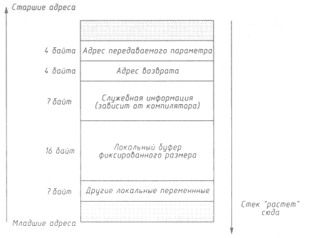 Рассмотрим его. Весьма часто в процедурах программист отводит для своих нужд некоторый локальный буфер, имеющий фиксированный размер. Этот размер обычно устанавливается исходя из здравого (или не очень здравого) смысла. Например, если читается строка с экрана, то программист может ограничить размер буфера 80 символами, имя файла на NTFS не должно содержать более 255 символов - именно такой буфер может быть отведен в этом случае и т. п.