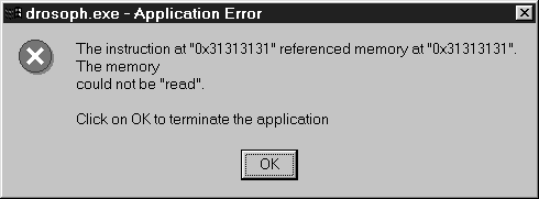 Не случайно в приведенных выше рассуждениях ни разу не встретилось упоминания о конкретной операционной системе. Действительно, технология переполнения локального буфера весьма универсальна и будет работать практически в любой ОС (об ограничениях чуть ниже), поэтому читатель может скомпилировать программу-дрозофилу в его любимой ОС и посмотреть на результат, подав на вход, скажем, строку из 30 единиц (этого должно быть достаточно для любой ОС и любого компилятора). UNIX-системы при этом выведут что-то типа "Segmentation fault, core dumped". Информация от Windows NT (рис. 9.2) для хакера более наглядна - по ней сразу понятно, что произошло именно переполнение буфера с возможностью подмены адреса возврата, так как адрес, на котором "споткнулась" программа, был не чем иным, как 0х31313131. Это соответствует шестнадцатеричному коду для строки из четырех единиц. Если ввести строку, состоящую из неодинаковых символов, например 01234567890abcdefghijklmnopqst, то по выведенному адресу станет ясно, в каком месте строки должен стоять будущий адрес возврата.