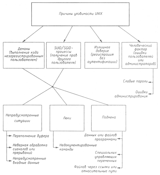 Рис. 9.4. Причины уязвимости UNIX