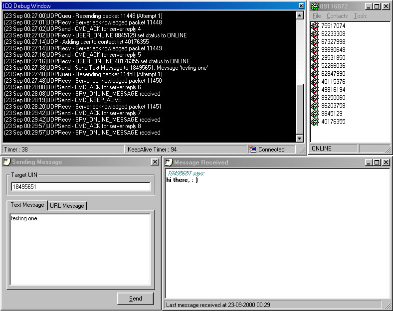 Первый ICQ клиент сделанный в VB, в настоящее время он может посылать и принимать сообщения/url. Проверяет online/offline статус пользователей, изменяет статус на Invisible, Away, N/A, и т.д.