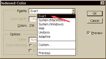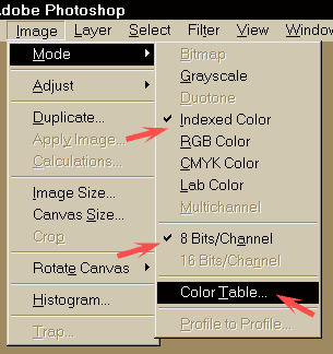 1. Открыть файл палитры. 2. Установить Mode/Indexed, используя опции 8 bits/pixel и exact palette. 3. В меню Mode выбрать Color Table. 4. С помощью кнопки Save сохранить палитру в удобном месте. 5. В следующий раз, подготавливая GIF, выберите Mode/Indexed, а палитру - Custom, и загрузите ранее сохраненный файл палитры. Если вы можете сократить палитру GIF до 216 цветов безопасной палитры, сделайте это.